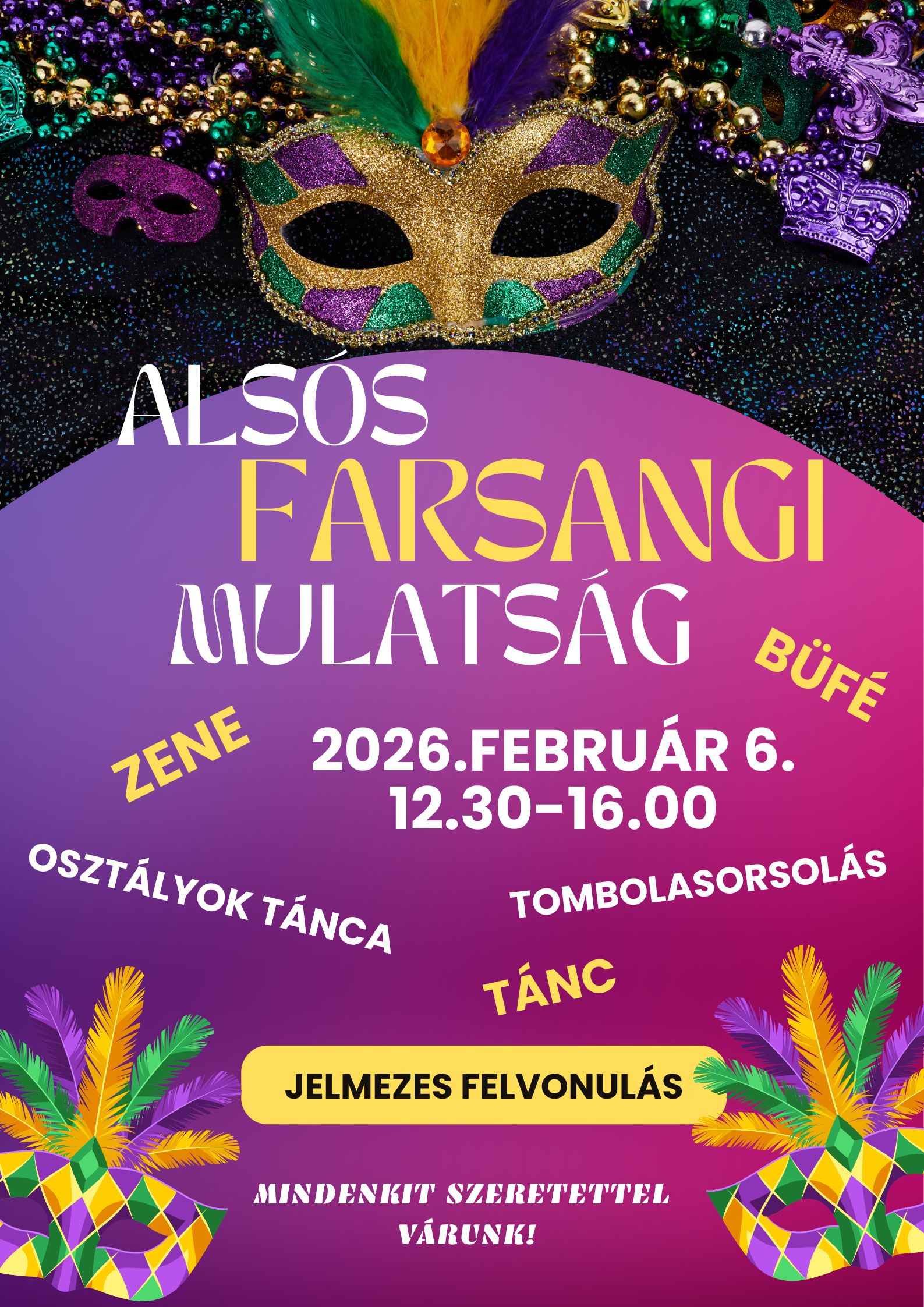 Elsőként az alsós diákok vették birtokba a helyszínül szolgáló tágas sportcsarnokot. A 3. évfolyamosok zenés, verses köszöntőjével kezdetét vette az iskolai farsang. A néptáncosok fergeteges bemutatója megalapozta a kedvet a közös mulatozáshoz. A tanító nénik meglepetés tánca pedig a parkettre csalta az összes diákot. Természetesen a jelmezes felvonulás sem maradhatott ki a sorból. A tombolasorsolás és az „ünnepi lakmározás”- a szülők nagylelkű felajánlásainak köszönhetően - már az osztálytermeken belül zajlott.